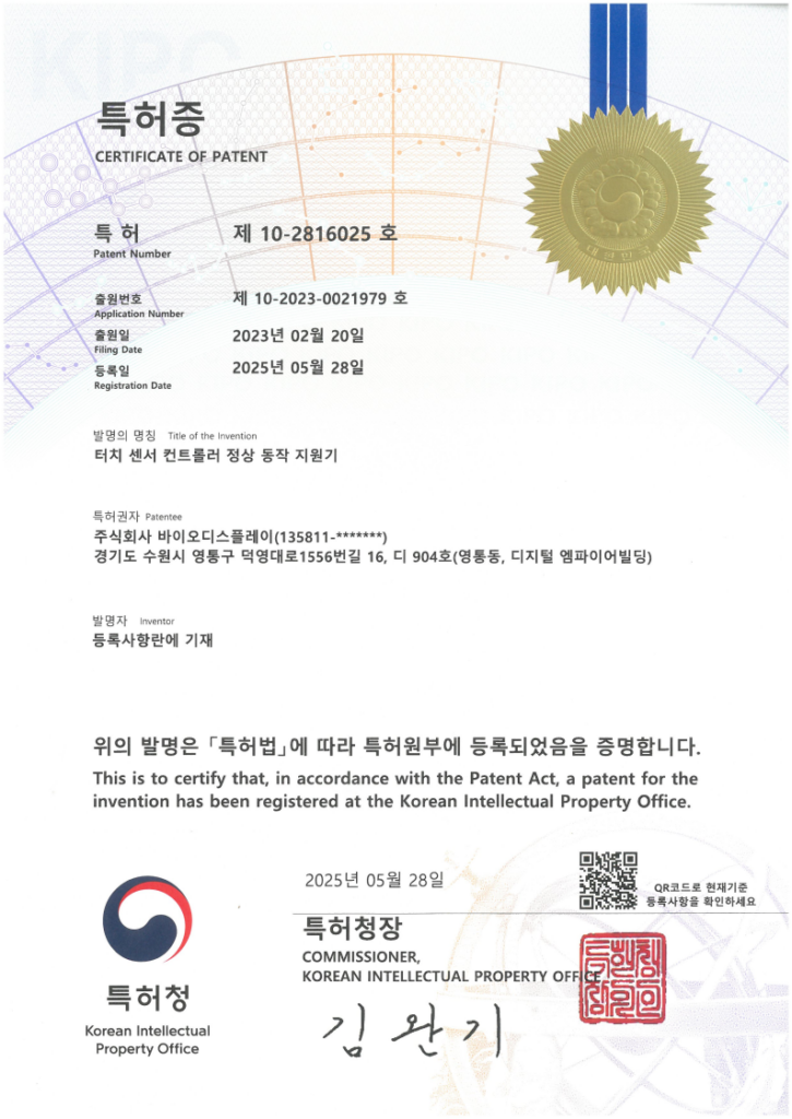 About BIODISPLAY 바이오디스플레이는 산업용 디스플레이 및 Out Door 용 HMI(Human Machine Interface), AI 통합 Vision & Image Processing 제품의 개발 및 생산,제작 전문 업체입니다.설립 이후 현재 까지 전기차 충전용 HMI 를 북미 수출향으로 ‘S’ 사에 전량 납품함으로 제품의 신뢰성을 입증 받았으며 이를 바탕으로 내수 시장도 점진적으로 확대 예정입니다. 01. 설립일 2020 년 8월 7일 02. 사업분야 산업용 Embedded System, 옥외용 HMI, 터치센서 개발, AI 통합 Image Processing 개발 특허증